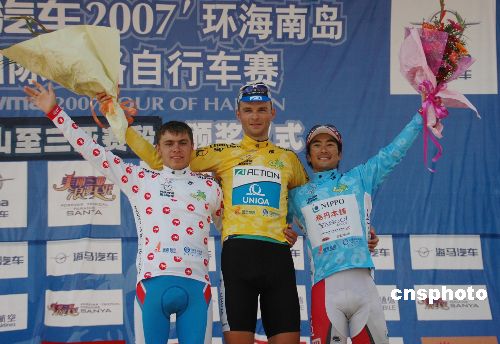 十一月十日,“海馬汽車”二00七環海南島國際公路自行車賽結束了所有的比賽,波蘭隊車手羅伯特·仁多士以二十六小時四十分四十八秒的總成績獲得個人總成績冠軍,他還獲得了第七賽段五指山至三亞分賽段冠軍和沖刺王。日本隊車手岡崎和也以二十六小時四十一分二十一秒的成績獲得亞洲最佳。俄羅斯隊車手米海勒·安德諾夫穿上了象征爬山王的圓點衫。波蘭隊還獲得了本屆賽事的團體冠軍,成為本屆比賽的最大贏家。中新社發 尹海明 攝