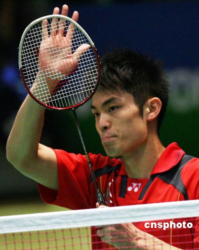 十一月二十九日,二零零七中國香港羽毛球超級賽進行正賽第二輪的比賽,頭號種子林丹以二比零戰勝日本選手佐藤翔治,輕松晉級。中新社發 武仲林 攝