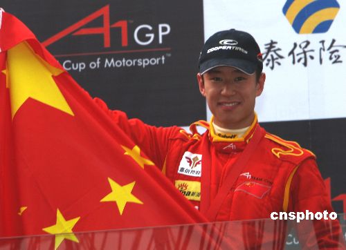 A1GP世界杯汽車大獎賽2007/08賽季中國站12月16日在珠海國際賽車場舉行,在沖刺賽的比賽中,A1中國隊車手程叢夫表現出色獲得第三名,五星紅旗高高飄揚珠海國際賽車場。中新社發 趙振清 攝