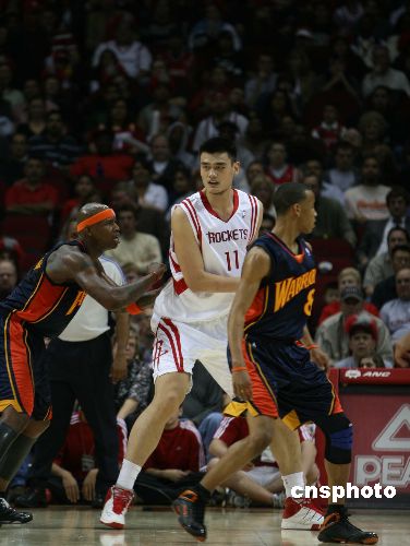 休斯頓火箭隊(duì)三十一日晚在主場(chǎng)豐田體育中心以九十五比一百一十二負(fù)于來(lái)訪的金州勇士隊(duì)。姚明在比賽中僅有八次出手,得到了十六分。阿爾斯通拿下火箭隊(duì)當(dāng)晚最高的二十二分。圖為當(dāng)日的比賽。中新社發(fā) 楊晉生 攝