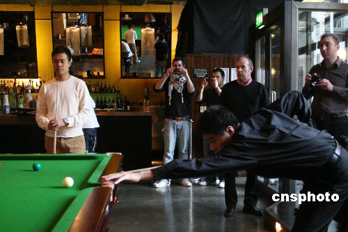 當(dāng)?shù)貢r間一月九日下午,中國“臺球神童”丁俊暉(擊球者)和香港名將傅家俊(穿白衣者)在倫敦唐人街的一間酒吧“過招”,推廣將在本月十三日開始的溫布利大師賽。中新社發(fā) 李鵬 攝