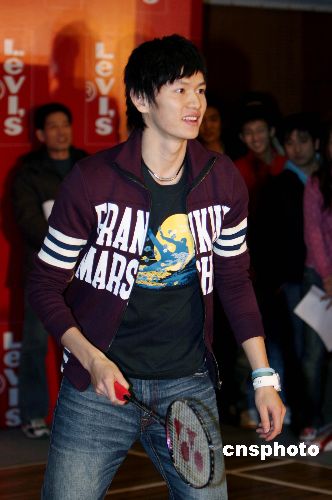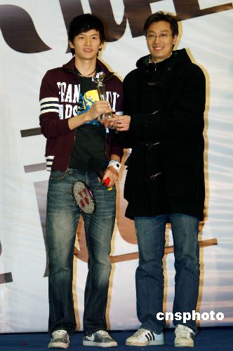 1月29日,北京某品牌服飾請來潮流天王陳冠希及內地知名設計師樊小博分別設計限量Sports概念Tee。在發布會現場,主辦方特別邀請了2008年奧運金牌有力競爭者——羽毛球國手鮑春來出席宣傳活動。中新社發 袁方 攝