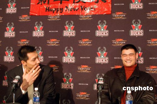 當地時間二月二日,姚明率領休斯敦火箭隊作客密爾沃基布拉德利球館,最終火箭隊以九十一比八十三險勝另一名中國球員易建聯所在的雄鹿隊,獲得三連勝。賽后兩位“中國德比大戰”的主角在雄鹿隊特地安排的聯合記者會上談笑風生,一同向中國球迷致以新春祝福。中新社發 李靜 攝