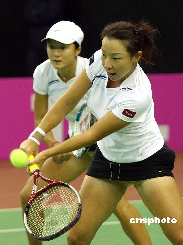 2月3日,2008聯合會杯世界一組第一輪進入第二日爭奪。在北京國際網球中心,中國隊迎戰前冠軍法國隊。黃金組合鄭潔/晏紫直落兩盤以7-5/7-6(5)擊敗德切/拉扎諾,從而助中國隊以3-2擊敗法國隊,進而改寫了中國隊參加聯合會杯27年歷史以來的最佳戰績——首次闖入4強。中新社發 富田 攝