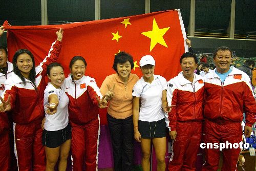 圖為賽后網球運動管理中心主任孫晉芳與運動員們一同慶祝。