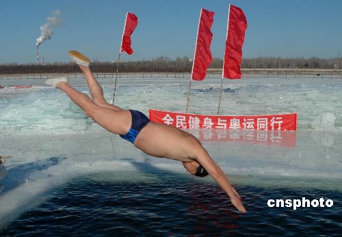 2月7日,黑龍江黑河市冬泳俱樂部與俄羅斯布拉戈維申斯克市冬泳俱樂部的30多名隊員,在黑河市中俄界江冒著零下30度的嚴寒,以冬泳方式歡度新春佳節。中新社發 邱齊龍 攝
