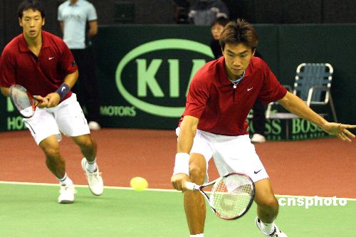 2月9日,2008年戴維斯杯亞大區II組中國隊vs黎巴嫩隊比賽在北京國際網球中心進行了第三場雙打比賽的較量。于欣源/曾少昡 以6:2,7:6(4),6:2戰勝黎巴嫩的吉桑·扎阿蒂尼/帕蒂克·楚克里雙打組合。盡管后兩場單打還沒進行,中國隊總比分3:0已經確保勝利晉級下輪。中新社發 富田 攝