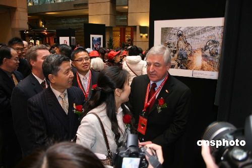 當?shù)貢r間二月九日上午,巡回世界的“新北京、新奧運”北京奧運圖片展在加拿大溫哥華市中心開幕。圖為加拿大聯(lián)邦政府國際貿(mào)易部長艾民信(右)等政府官員參觀展覽。預計二十一天的展出將至少吸引三萬名觀眾,兩年后將主辦冬奧會的溫哥華正在掀起新的奧運高潮。中新社發(fā) 呂振亞 攝