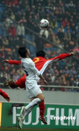 2月17日,2008東亞足球錦標(biāo)賽揭幕戰(zhàn)在中國(guó)重慶打響,中國(guó)男子足球隊(duì)(紅衣)仍未打破“恐韓”魔咒,終場(chǎng)前約兩分鐘被韓國(guó)隊(duì)攻入制勝一球,以2:3惜敗。中新社發(fā) 郭晉嘉 攝
