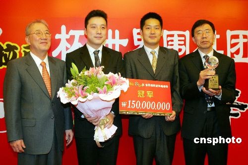 2月21日,第9屆農心杯中日韓三國圍棋擂臺賽在上海進行第13局較量,由中方副將常昊迎接韓方主將樸永訓挑戰,結果常昊執黑227手中盤戰勝樸永訓,幫助中國隊實現農心杯冠軍“零的突破”。圖為右起中國棋院院長華以剛、中國棋手常昊、古力手捧冠軍獎杯與獎金。中新社發 湯彥俊 攝