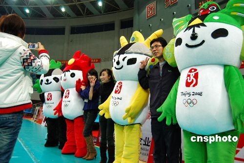 2月25日晚,中國女排與古巴女排零八年第二場對抗賽在僑鄉晉江舉行。圖為奧運福娃成場外大明星,僑鄉觀眾爭相合影。中新社發 傅丹丹 攝