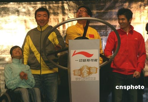 3月22日,“李寧零八中國(guó)之旅”活動(dòng)在北京朝陽公園啟動(dòng),該活動(dòng)將通過“大篷車”巡游的形式,歷時(shí)9個(gè)月,行程4萬公里,途經(jīng)全國(guó)近百座中型城市宣傳奧運(yùn)精神、大屏幕直播北京奧運(yùn)會(huì)比賽,并開展三加一籃球挑戰(zhàn)賽等一系列全民健身活動(dòng)。 圖為前中國(guó)體操隊(duì)選手桑蘭(左一)、奧運(yùn)冠軍楊凌(左二)、邢傲偉(左四)等在啟動(dòng)儀式上。中新社發(fā) 沈晨 攝