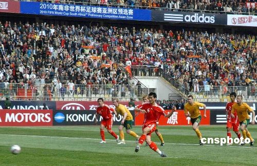 三月二十六日,中國男子足球隊與澳大利亞隊的世界杯預選賽在昆明拓東體育場舉行,在全場三萬兩千名觀眾的助威吶喊聲中,中國隊在主場得勢不得分,最終與澳大利亞隊零比零握手言和。中國隊邵佳一在臨近終場時罰失一個點球,成為本場比賽最大遺憾。圖為邵佳一罰失點球瞬間。中新社發 石雨 攝