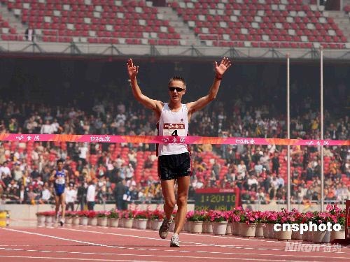 4月18日,國(guó)家體育場(chǎng)“鳥巢”迎來(lái)首場(chǎng)賽事,“好運(yùn)北京”2008國(guó)際田聯(lián)競(jìng)走挑戰(zhàn)賽在此打響。在男子20公里競(jìng)走比賽中,澳大利亞選手塔倫特以1小時(shí)20分11秒的成績(jī)摘得了“鳥巢”建成以來(lái)的首枚金牌。中新社發(fā) 富田 攝