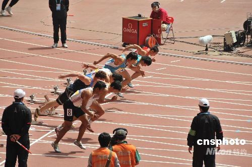 “好運北京”2008年全國田徑錦標賽暨中國田徑公開賽,自5月22日至25日在國家體育場“鳥巢”舉行,22日上午九點比賽開始前,全體觀眾、運動員、工作人員起立,向四川地震遇難同胞默哀;今天上午進行的項目有:女子七項全能100米欄、男子F/55/56/57/58標槍決賽、女子100米欄預賽 、男子跳遠及格賽A/B、 男子1500米預賽 、女子七項全能跳高A/B 、男子鉛球及格賽 A/B、 女子1500米預賽、 男子400米預賽、女子400米預賽等。中新社發 馮軍(北京) 攝