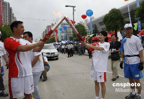 5月28日上午8時,北京奧運會火炬接力安徽的傳遞活動在合肥拉開帷幕。合肥籍世界跳水冠軍李娜擔任第一棒火炬手。圖為李娜將圣火傳遞給抗震勇士合肥市特警支隊的火炬手周世軍。中新社發 張婭子 攝
