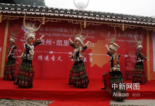 6月13日,奧運火炬在貴州黔東南傳遞,郎德苗寨的姑娘們載歌載舞迎接奧運火炬。記者周兆軍攝