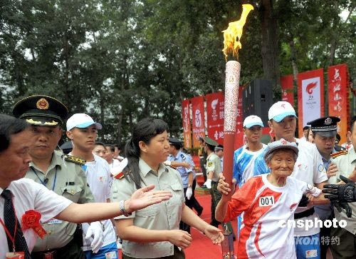 7月2日8時14分,在奧運火炬延安傳遞的起點棗園,92歲的老紅軍劉天佑起跑延安火炬傳遞的第一棒。 中新社發 廖攀 攝