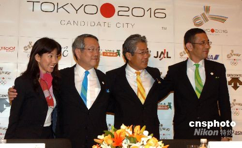 8月4日,東京2016年奧運會申辦委員會在北京舉辦東京申辦2016年奧運會新聞發(fā)布會。圖為日本奧林匹克委員會主席、東京2016年奧運會申辦委員會副主席竹田恒和(右三)、東京2016年奧運會申辦委員會主席兼首席執(zhí)行官河野一朗(右二)、東京都政府申辦推廣部執(zhí)行總監(jiān)中村年長(右一)、東京2016年奧運會申辦委員會國際宣傳部總監(jiān)仲川美穗子(左一)在會上合影。中新社發(fā) 鄒憲 攝
