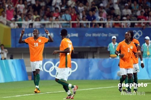 8月7日,北京奧運會上海足球分賽場男足預賽,作為首次參加奧運會足球比賽的科特迪瓦,在遭遇衛(wèi)冕冠軍阿根廷隊時毫不示弱,球員門以精湛的球技,征服現(xiàn)場球迷贏得掌聲。圖為科特迪瓦18號球員塞古·西塞(CISSE Sekou)進球后歡慶。中新社發(fā) 湯彥俊 攝