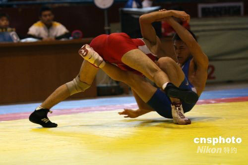 9月27日,運動員在進行自由式摔跤比賽。當日,全國男子自由式摔跤冠軍賽在河南許昌開賽,來自全國各地的340余名運動員在為期3天的比賽中展開角逐,比賽采用單敗淘汰全復活賽制,分別進行資格賽、淘汰賽等。本次摔跤比賽由國家體育總局舉摔柔運動管理中心主辦,河南省體育局和許昌市體育局承辦。中新社發 牛書培 攝