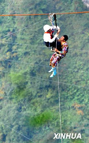 10月18日,新疆“達(dá)瓦孜”傳人賽買提·艾山在湖南張家界市天門山挑戰(zhàn)世界最大坡度高空走鋼絲時發(fā)生意外,在距終點50米處跌坐在鋼繩上,被迫放棄挑戰(zhàn)。意外發(fā)生后,地面安全人員及時展開救援,歷時1小時16分鐘將懸坐在400米高空鋼繩上的賽買提順利救出。 新華社記者龍弘濤攝