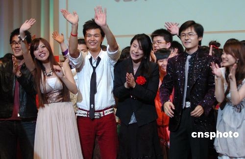郭晶晶(右三)和歌手阿蘭(左二)與兩國青年共同高歌《明天會更好》。