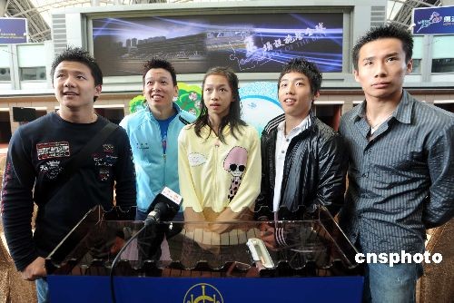 十一月二十日,北京奧運(yùn)金牌運(yùn)動(dòng)員代表團(tuán)再度訪港,并獲邀出席香港沙田馬場(chǎng)三十周年祝愿儀式。圖為奧運(yùn)體操金牌運(yùn)動(dòng)員(左起)陳一冰、黃旭、江鈺源、鄒凱及肖欽接受媒體訪問。中新社發(fā) 鄧慶樂 攝