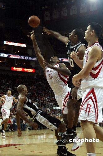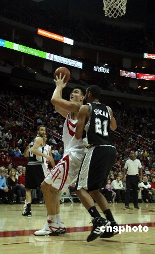 當(dāng)?shù)貢r(shí)間11月29日晚,火箭在主場(chǎng)以103-84大勝馬刺,成為西南區(qū)的領(lǐng)頭羊。火箭首發(fā)五虎得分都上雙,姚明打了27分鐘,拿下12分,但只搶1個(gè)籃板,蓋帽3次。中新社發(fā) 歐文 攝