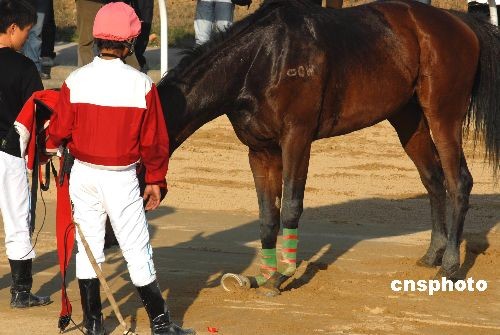 11月30日,在湖北武漢市“東方馬城”舉行的2008年全國速度賽馬錦標賽上,2600米沙地無限定馬決賽第二組在比賽時,發生賽馬“追尾”驚險一幕。在跑到第二圈進入最后全力沖刺時,新疆隊唐旭駕馭的7號馬“巴黎之眼”避讓不及北京隊魏云忠駕馭的10號馬“賽速”,兩馬重重地撞在一起,“巴黎之眼”當場被撞暈倒地不醒,“賽速”右前蹄則被撞斷受傷嚴重,所幸兩名運動員均無大礙。據業內人士介紹,賽馬運動屬于高風險運動,運動員和馬匹在激烈的比賽過程中,都有出現意外的可能。中新社發 楚天行 攝