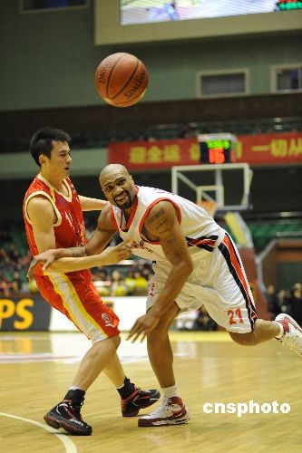 12月5日,2008—2009賽季CBA聯賽第九輪在山東濟南的一場比賽中,主場作戰的山東黃金隊以108比78戰勝青島雙星隊。中新社發 張侃 攝