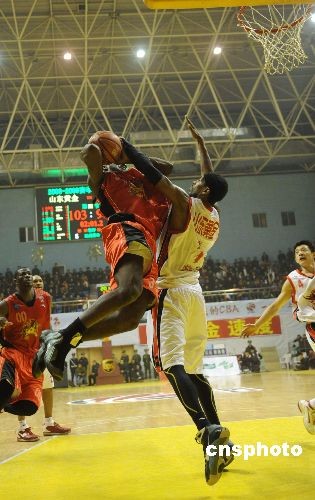 2月6日,2008—2009賽季CBA聯賽常規賽第32輪在山東臨沂的一場比賽中,山東黃金隊主場106:103戰勝山西中宇隊。中新社發 張侃 攝