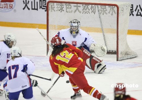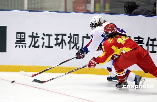 2月18日,第24屆國際大學生冬季運動會在哈爾濱冰球館拉開戰幕。當日大冬會女子冰球比賽將在哈爾濱冰球館進行3場比賽,首場斯洛伐克隊(白)對中國隊(紅),比賽進行到10時20分中國隊進首球。中新社發 姚庭山 攝