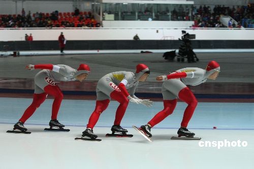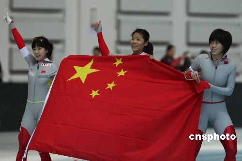 2月26日,大冬會速度滑冰女子團體追逐賽,中國隊以3分07秒38獲得冠軍。中新社發 王忠言 攝