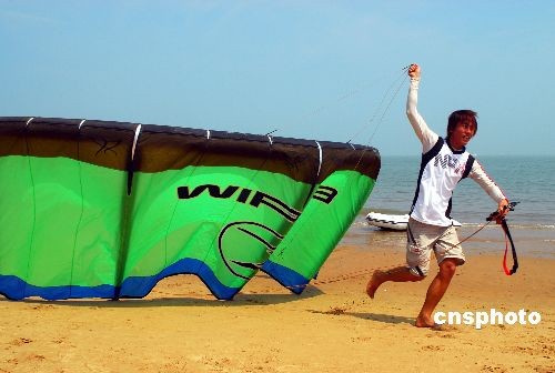 3月19日,為期兩天的“2009?诜弭唢L箏沖浪邀請賽”在?谑形餍愫╅_幕。這是我國首次舉辦國際性風箏沖浪大賽。比賽設公開級風箏沖浪場地賽、風箏沖浪自由花式賽、公開級帆板場地賽和特邀組帆板場地賽等多個項目。中新社發 善平 攝