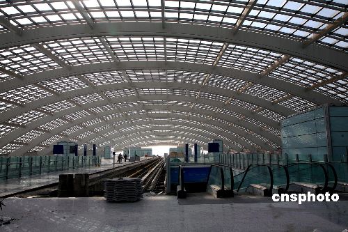 2007年11月6日,北京首都機(jī)場(chǎng)輕軌“3號(hào)航站樓站”接近尾聲,該車(chē)站位于首都機(jī)場(chǎng)3號(hào)航站樓前的交通中心內(nèi),旅客可通過(guò)扶梯直達(dá)3號(hào)航站樓。機(jī)場(chǎng)線全長(zhǎng)28.1公里,自西向東共設(shè)置了4座車(chē)站,起點(diǎn)站——“東直門(mén)站”與地鐵2號(hào)線和13號(hào)線互為換乘站,另外還包括三元橋站(與10號(hào)線互為換乘站)和“2號(hào)航站樓站”(位于2號(hào)航站樓與停車(chē)樓之間的綠地及現(xiàn)狀道路之下,旅客可經(jīng)通道直達(dá)2號(hào)航站樓)。該工程預(yù)計(jì)2008年4月建成,7月1日開(kāi)始載客試運(yùn)營(yíng)。屆時(shí),機(jī)場(chǎng)輕軌最高運(yùn)營(yíng)速度100公里/小時(shí),東直門(mén)至首都機(jī)場(chǎng)運(yùn)行時(shí)間為16分鐘。中新社發(fā) 洪濤 攝