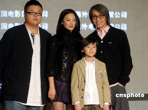 十一月二十二日,周星馳攜張雨綺(左二)、徐嬌(右二)、林子聰(左一)在北京出席其新片《長江七號》的發(fā)布會,他接受記者采訪時坦言這部電影是源自自己從小的一個夢想,并曾真的見過兩次UFO。中新社發(fā) 廖攀 攝