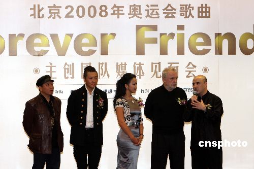 十一月二十九日晚,北京奧運會歌曲《Forever Friends》音樂電視拍攝順利收工。該歌曲由意大利作曲家喬吉奧.莫洛德爾領(lǐng)銜作曲,德國詞作家邁克爾.昆茨作詞,中國音樂家孔祥東擔(dān)綱制作,李汶、孫楠演唱。中新社發(fā) 任海霞 攝