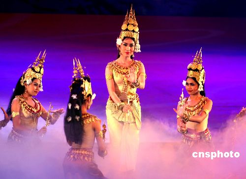 中國中央電視臺2008元旦雙語(漢語、英語)晚會,12月31日晚在北京歡樂谷華僑城大劇院隆重舉行,中央電視臺國際頻道向全世界實況直播。晚會除中國演員外還有日本、韓國、泰國、馬來西亞、新加坡、印度等國家的藝術家登場獻藝,通過歌曲、舞蹈、雜技、魔術、服裝秀、戲曲等藝術形式,向全球華人送去新年祝福。中新社發(fā) 宋吉河 攝