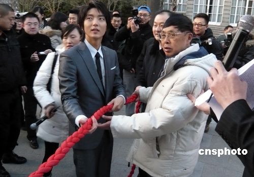 1月13日,愛浪(國際)文化產(chǎn)業(yè)集團與韓國COMA公司在北京中國人民對外友好協(xié)會舉行締結(jié)聯(lián)盟簽約儀式,雙方將在多個文化項目上進(jìn)行合作,圖為在簽約儀式前中國人民對外友好協(xié)會會長陳昊蘇與“中韓文化交流大使”韓國人氣偶像李俊基等一起敲響“和平友誼鐘”。中新社發(fā) 錢興強 攝