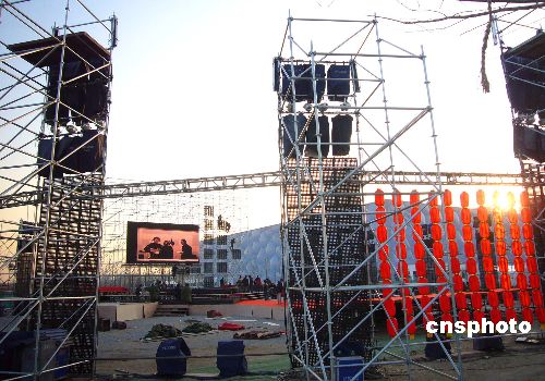 2月1日,施工人員正在國家體育場(“鳥巢”)和國家游泳中心(“水立方”)之間搭建“春節聯歡晚會”的演出設施。據悉,除夕夜奧運建設者們將可現場觀看到有關節目。 中新社發 玉龍 攝