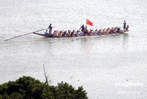 5月11日下午,北京奧運火炬在福州最美的江濱大道上進行傳遞,福州民眾在閩江劃龍舟追隨火炬傳遞隊伍。 中新社發 王東明 攝