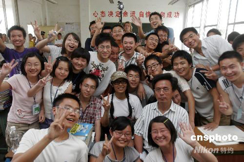 5月26日下午,韋唯在地震重災區四川什邡市什邡中學看望復課學生,幫助災區學生找回笑臉。中新社發 張曉理 攝