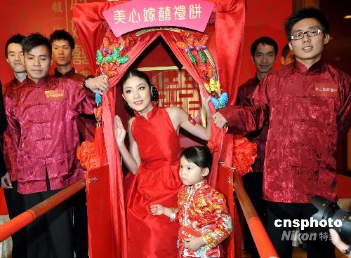 九月三日,某商家特邀即將于十月出嫁的香港歌星陳慧琳穿著裙褂,坐著八人大紅花轎出席新聞發布會,為活動宣傳造勢。中新社發 鄧慶樂 攝