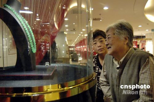 “十一黃金周”臨近,一款估價(jià)為1.2億元的天價(jià)翡翠項(xiàng)鏈亮相某珠寶商城,為節(jié)日市場先期預(yù)熱,由57顆顏色濃綠、質(zhì)地細(xì)膩的“老坑玻璃種”翡翠珠子串成的翡翠項(xiàng)鏈,懸賞總價(jià)值10萬元的翡翠飾品作為獎(jiǎng)品向全球征名,以期弘揚(yáng)中華傳統(tǒng)玉文化。中新社發(fā) 徐曦弋 攝