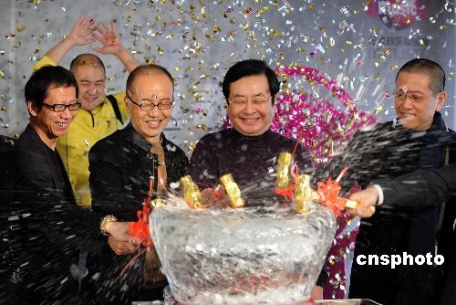 十二月二十七日,陳其鋼、曾慶淮、陳丹青等揮錘砸爛冰制鳥巢,取出《我和你》珍藏版專輯正式發布。陳其鋼是北京奧運會開幕式音樂總設計,北京奧運會開幕式主題曲《我和你》的作者。中新社發 廖攀 攝