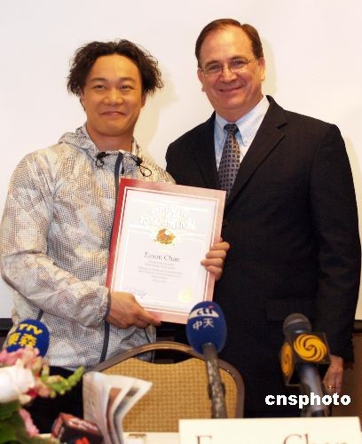 當(dāng)?shù)貢r(shí)間3月19日,香港歌星陳奕迅飛抵美國(guó)洛杉磯參加世界巡回演唱會(huì),受到加州眾議員夏樂(lè)柏頒獎(jiǎng)歡迎。 中新社發(fā) 盧威 攝