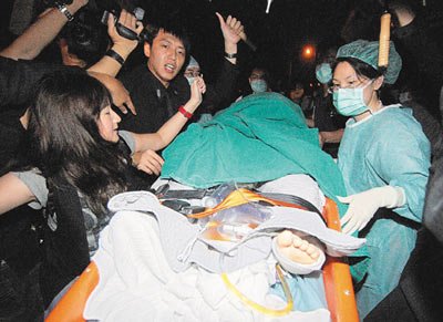 Selina24日一下專機(jī),即被救護(hù)車火速送往林口長庚醫(yī)院,當(dāng)時她從頭到腳都包著綠色床單,躺在擔(dān)架床上,她的四周還有十多名經(jīng)紀(jì)公司人員,撐傘擋住記者鏡頭,完全看不到她的表情,她也沒有發(fā)言,記者則不斷推擠,現(xiàn)場十分混亂。