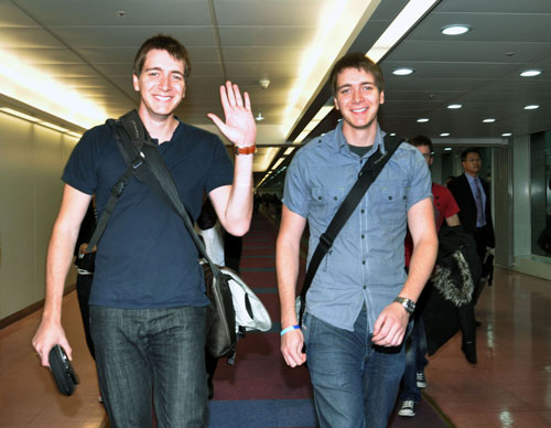 《哈利波特》系列電影《哈利波特:死神的圣物》先前在倫敦首映掀熱潮,電影19日將在臺(tái)灣上映。片中榮恩的雙胞胎哥哥“弗雷”與“喬治”本人詹姆斯與奧立佛菲爾普斯(James & Oliver Phelps),在發(fā)行片商華納兄弟牽線下,15日上午搭機(jī)抵臺(tái),為新片宣傳。