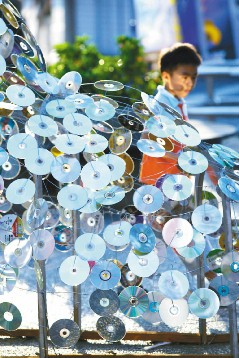中新網(wǎng)11月8日電 據(jù)臺灣《聯(lián)合報》報道,午后陽光泄照下,臺中市綠園道上,由廢光盤片所組合的裝置藝術(shù),吸引了路人的注目,也讓人感受到廢物利用的美意。